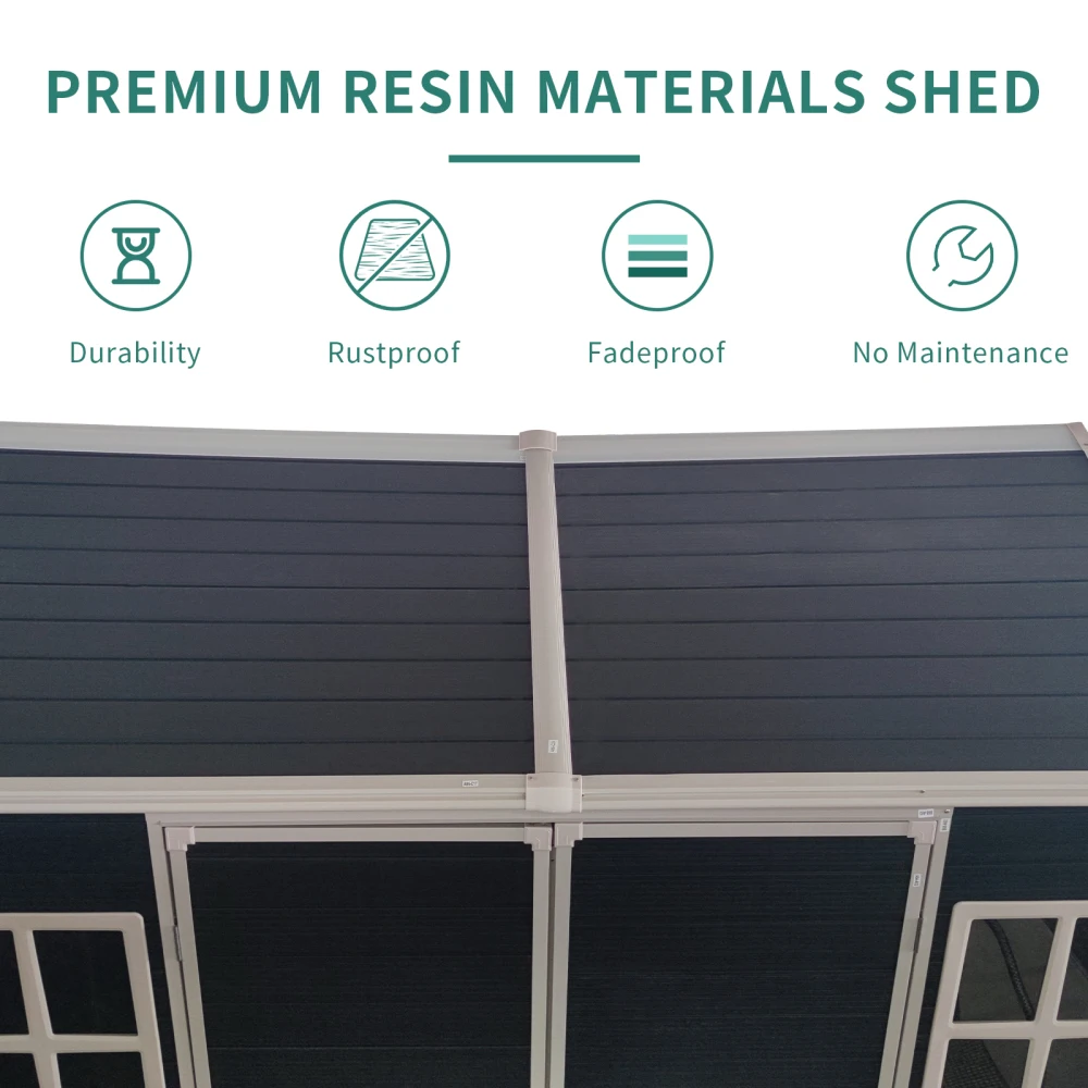 - High-Quality Double-Layer Material: Made of 14mm thick polypropylene double-layer resin plastic, this resin shed is built to last. It's recyclable, corrosion-resistant, waterproof, and rust-proof, providing a maintenance-free storage solution that's perfect for all weather conditions.
